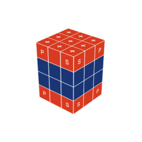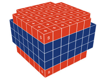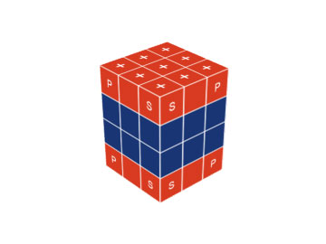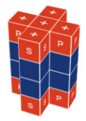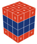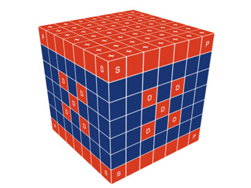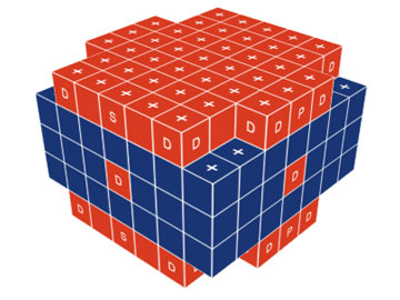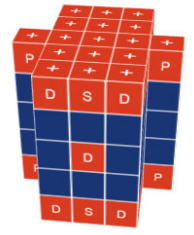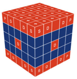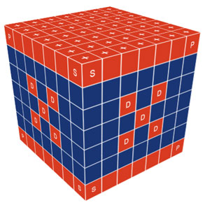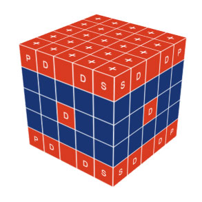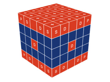 The red cube stands for proton, blue cube stands for neutron, "+" sign stands for spin up, "-" sign stand for spin down. Both proton and neutron have half spin. Atomic Nucleus Oganesson Og-342, 118.224.-2, has 118 protons, 224 neutrons, -2 is the double value of nucleus spin. Og-342 has a complete 7x7x7 cubic structure with one empty center, 7x7x7-1=342. s-p stand for 8 corner proton, d stand for 5 face center proton, 4 side face has total 20 d proton, f stands for 4 back face proton.